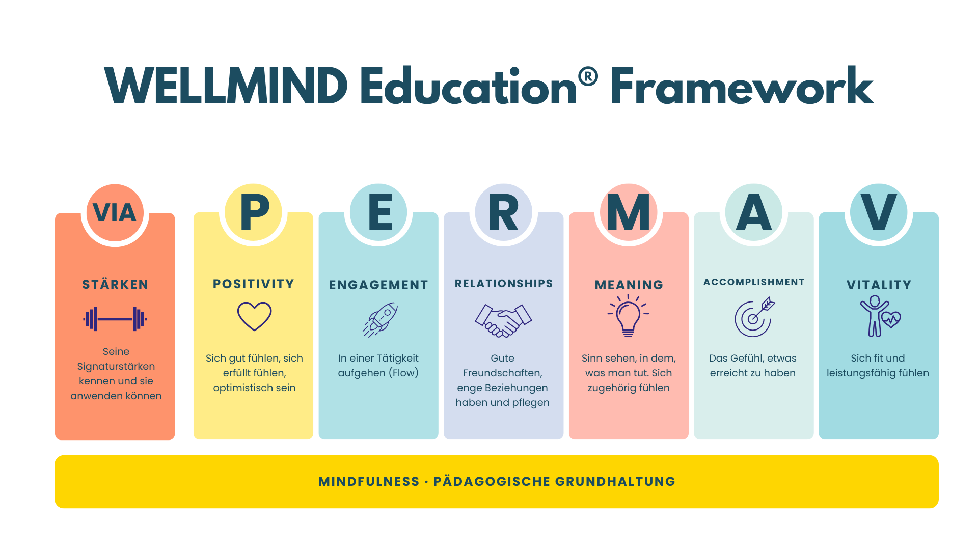 Unsere Angebote und unsere Arbeit und unser WELLMIND Curriculum basieren auf evidenzbasierten Modellen. Das bekannte PERMA-V-Modell (Seligmann) bildet die Grundlage und wird erweitert um das Element der Stärkenorientierung (VIA Character Strength) und Mindfulness (als pädagogische Grundhaltung UND als Mindwork für Kids & Teens).